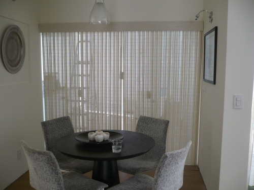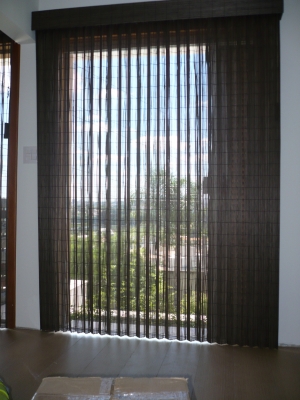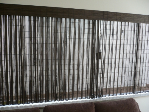 Cortina de bambu (coleção BAMBOO) sanfonada: os palitos ficam na vertical, corre lateralmente em trilho.